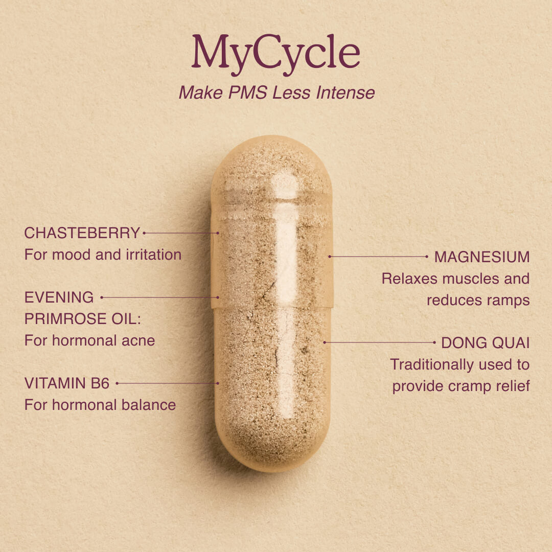 MyCycle’s unique formula tackles some of the most common symptoms of PMS with natural ingredients that work with your hormonal health.